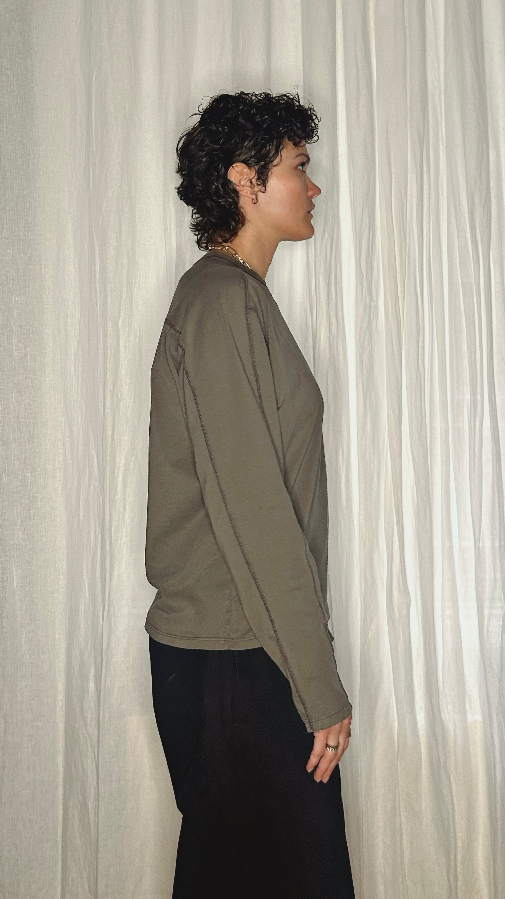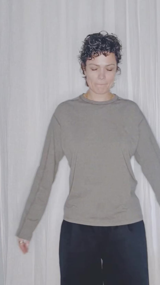 The Willow LS is a long-sleeve made from 100% organic cotton, knitted and sewn in Portugal. It features a double-layered rib at the neckline, flatlock seam construction, a straight hem, and logo embroidery below the back seam.